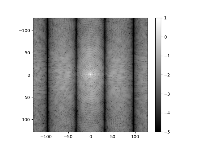 Consider the scenario that while the MRI data are being collected, there are perturbations, and as a result, the k-space data are distorted. In this problem, we model these perturbations as multiplications with sine^2 or cosine^2 of k_r or k_c. Below are several k-space images that have been distorted in this way. In all cases, assume that only the magnitude of the k-space data was changed.