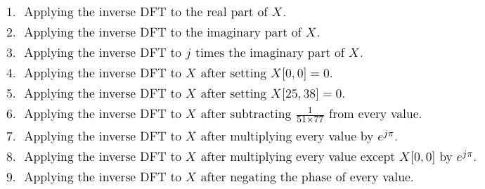 If an approach would have led to an image with nonzero imaginary components (and thus would have resulted in a Python error when trying to save the image), enter X for that approach.