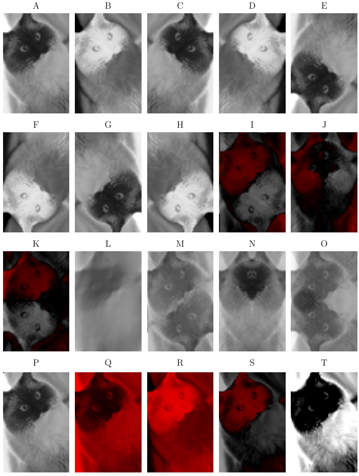 Ben tries several different methods of recovering the original image based on X[k_r, k_c]. For each of the methods described below, indicate which of the images on the next page (labeled A-T) would have resulted from that approach. In these images, grey colors represent positive values (black represents 0, white represents 1), and red represents negative values (black represents 0, bright red represents -1). For all parts, assume that r=0, c=0 corresponds to the upper-left corner of the image (rows increase downward, and columns increase to the right).