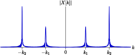 Imagine sampling this signal at a rate f_s = 2000 samples per second to produce a DT signal, and then computing the DFT of that signal with some value N, where N is a power of 2. Plotting the DFT magnitudes gives us the following graph for some range of k values (not necessarily the whole range of k values). Note also that we have plotted this as a line graph for clarity even though X[k] is actually a function of discrete k):