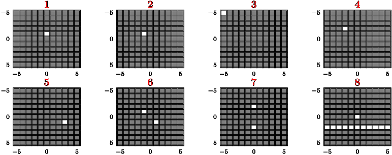 Each of the following panels illustrates an 11\times11 pixel image where gray represents a value of 0 and white represents a value of 1. Let r and c denote the row and column, respectively, with r increasing downward and c increasing to the right. The origin (r=c=0) of each of these images is in its center.