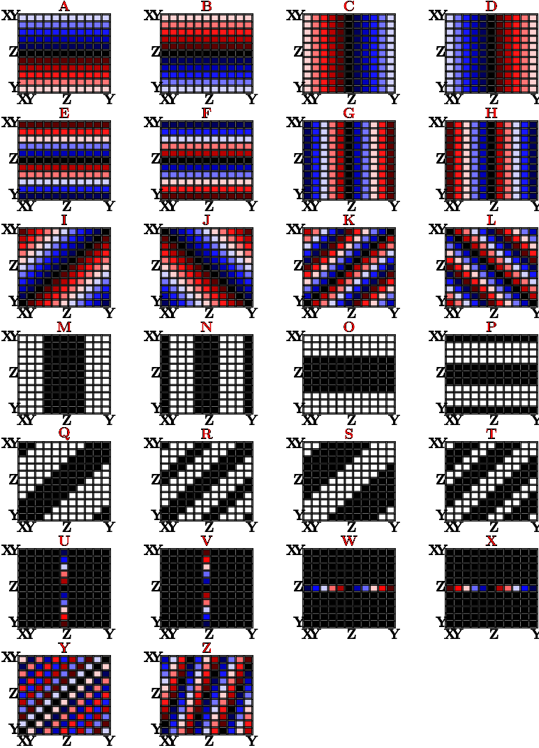 For each image above, determine which of the panels on the following page represents the angle of the (11\times11) DFT of that signal, where black represents 0, white represents \pi and -\pi, red represents positive angles, and blue represents negative angles (with \pi/2 represented by solid red, and -\pi/2 represented by solid blue). The origin of each of these panels is in the center of the panel, k_r increases downward, and k_c increases to the right. For reference, image A is a gradient in the vertical direction, starting at a value of -\pi in the first row and increasing linearly as k_r increases. The bottom row of image A has the value \pi.
