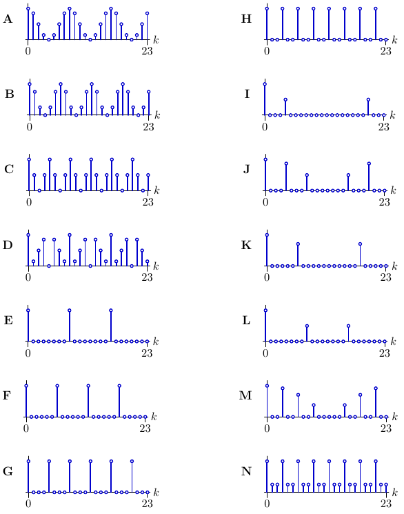 Determine which of the fourteen plots below corresponds to the magnitude of the 24-point Discrete Fourier Transform (DFT) for each of the previous signals, and enter the letter of the plot (A-N) in the box provided (above).