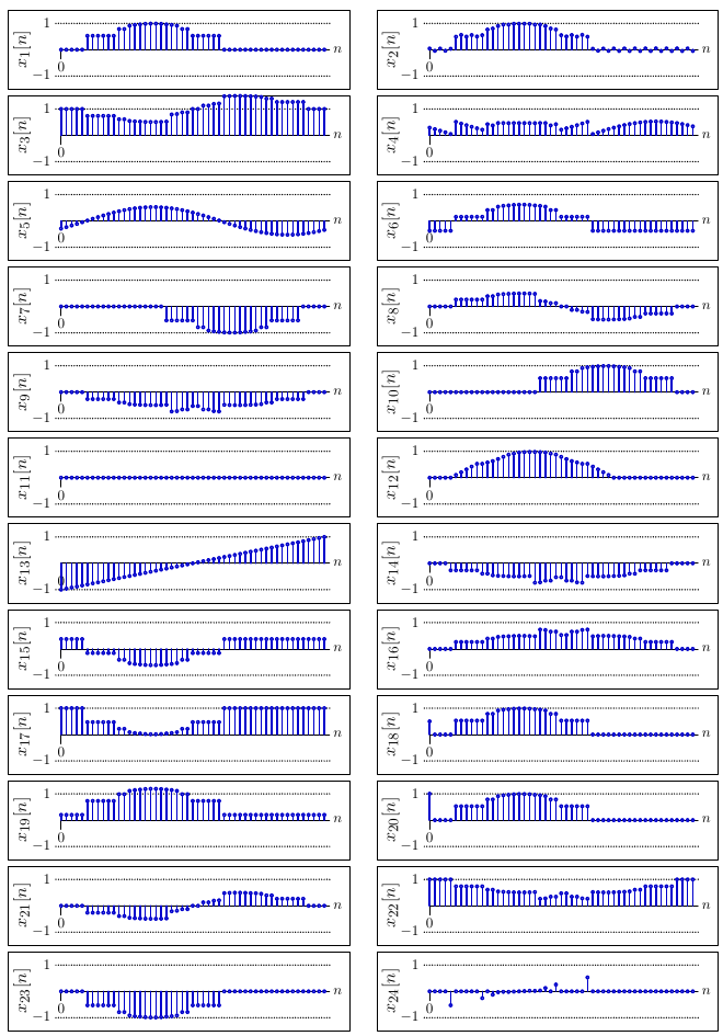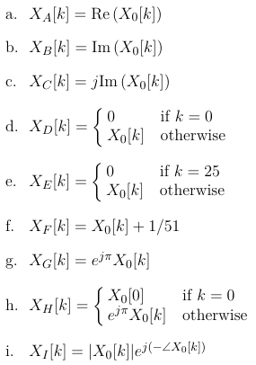 For each set of Fourier coefficients described below (X_A through X_I), determine the corresponding signal from the 24 options shown on the next page (x_1 through x_{24}).
