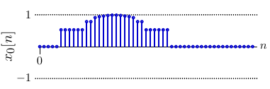 Ben Bitdiddle created a signal x_0[n] representing the MIT dome, but he only saved the DTFS coefficients X_0[k] (and not the original signal). However, he knew that one period of the original signal (which is periodic in N=51) looked like this: