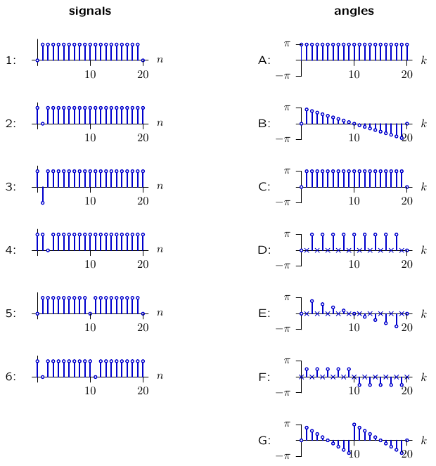 The signals shown in the left column are periodic in n with period N=20. The functions shown in the right column show the angles of Fourier series. For each signal, indicate which (if any) of the angle plots represents the angles of that signal's Fourier series coefficients (where an "X" indicates an undefined phase).