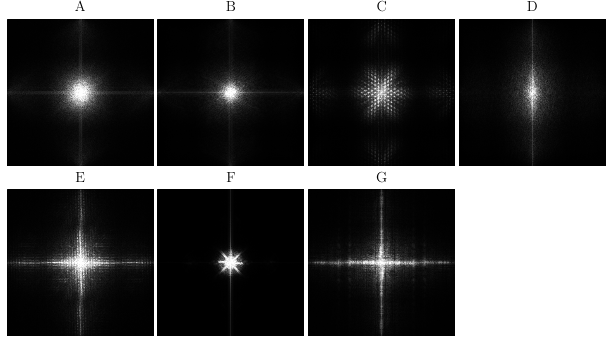 Each of the following 7 panels shows the magnitudes of the DFT coefficients associated with one of the above images. Notice that the origin (k_x=k_y=0) is in the center of each of these panels. as A through I):
