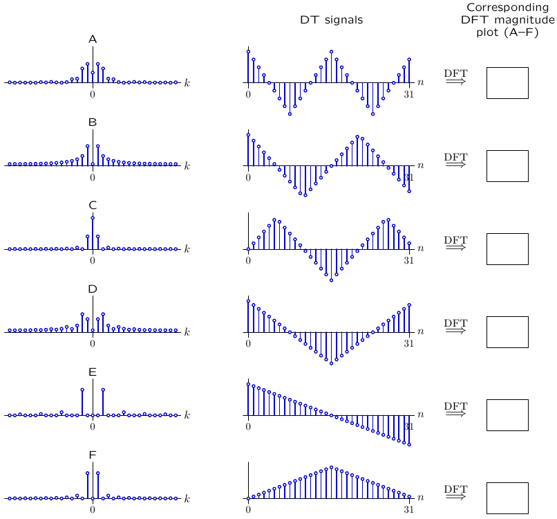 For each discrete-time signal in the center column below, find the matching DFT magnitude (one of plots A--F) and enter its letter in the box provided.