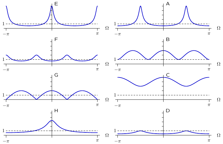 Each of the plots below shows the magnitude of the frequency response of discrete-time system that can be described by one of the following difference equations, where \alpha and m are parameters.